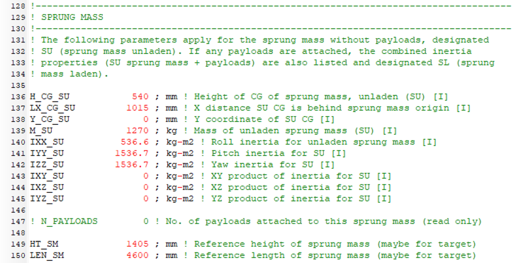 VS Math Models use consistent names for parameters of parts that are repeated in a model, such as tires, wheels, springs, etc. Parameters and Configurable Functions for repeated parts are indexed, such that a single text file can be used multiple times to set values for different components. For example, it is common to use the same set of tire properties for multiple tires in the vehicle model. Although the model contains separate equations and values in memory, the values can be set from the same file if it is read multiple times.